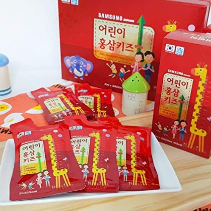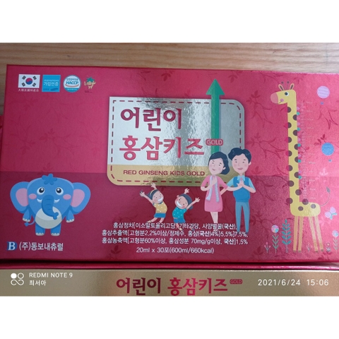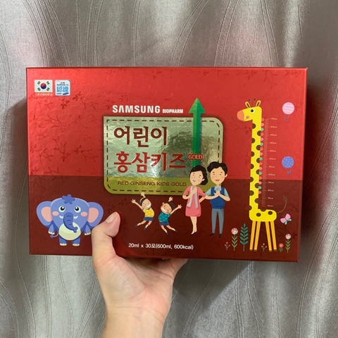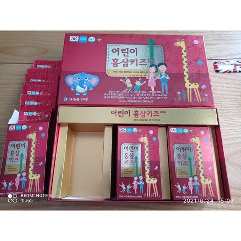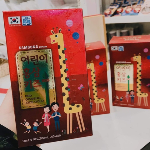 Nước Hồng Sâm Trẻ Em Red Ginseng Kids Gold Hàn Quốc Xuất xứ : Hàn Quốc Nước hồng sâm Hàn Quốc được kết hợp giữa tinh chất Hồng sâm cô đặc với các thành phần đông y bổ dưỡng như Nhung, Quế, Mật ong rừng, Vitamin…và một số thảo dược quý khác. Sản phẩm đã được điều chỉnh hàm lượng phù hợp với thể trạng lứa tuổi của trẻ nhỏ. Công Dụng: - Tăng cường hệ miễn dịch, nâng cao sức đề kháng cho các bé. - Phát triển chiều cao, trí não, tăng trí nhớ : Dùng hồng sâm baby hàng ngày sẽ bổ sung các chất bổ dưỡng để kích thích trí não hoạt động dẫn đến tăng cường phát triển trí nhớ và não cho bé. - Giải độc gan : Saponin trong Hồng sâm làm tăng hoạt động enzym liên quan tới sự thoái hóa ethanol và acetaldehyd, do đó giúp gan của bé có thể thanh lọc, giải độc. - Rất tốt cho đường ruột, cải thiện tình trạng biếng ăn, còi xương, suy dinh dưỡng : Trong hồng sâm Baby có bổ sung lượng Canxi, Vitamin và một số dược thảo đông y khác có thể cải thiện được đáng kể tình trạng biếng ăn ở trẻ, giúp trẻ ăn ngon miệng hơn, ngủ ngon hơn và phát triển xương. - Phục hồi mệt mỏi, giảm stress : Hồng sâm baby giúp cho các bé hay hiếu động hoặc các bé học tập cường độ cao nhanh chóng hồi phục sức khỏe, giảm căng thẳng mệt mỏi... Đối Tượng Sử Dụng: - Các bé có hệ miễn dịch kém, hay bị ốm vặt, suy dinh dưỡng, cơ thể suy nhược, thể lực yếu. - Các bé hoạt động nhiều, thiếu chiều cao, hay bị áp lực do cường độ học tập cao… Hướng Dẫn Sử Dụng: - Trẻ 3 tuổi uống 1/2 gói/lần, 2 lần/ngày. Tuần uống từ 3 – 5 gói - Trẻ từ 5 tuổi uống 1 gói/lần/ngày. Có thể uống hàng ngày - Nên uống vào buổi sáng, sau bữa ăn Chú ý : Sản phẩm không phải là thuốc và không có khả năng thay thế cho thuốc chữa bệnh